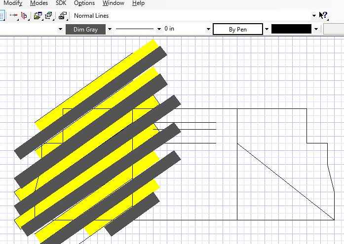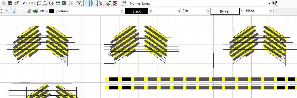 I put the picture into Turbocad and traced the end frame by the steps, and guessed some width of yellow stripes. The paper label is white, so I had to print the black space between the yellow. And I used one shade less than basic black, like a weathered surface. |