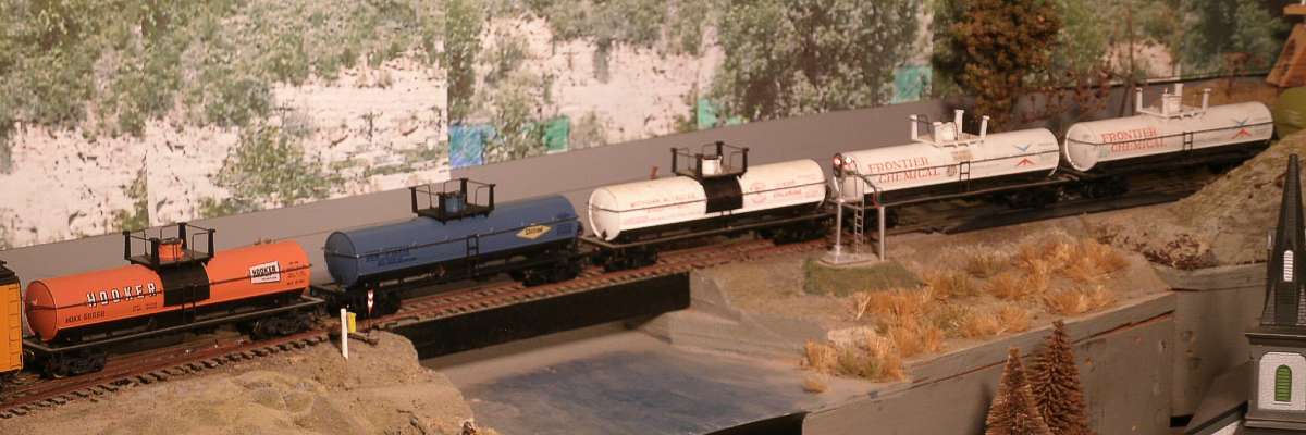 It took many years to gather a small fleet of chemical tank cars. I hadn't purchased many over the years because they have a slightly high center of gravity compared to an old boxcar. But, with proper location in a train, I have gotten better at not pulling them over. |