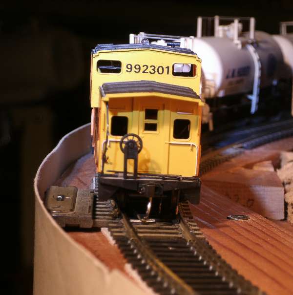 A strip of cardboard that rises 3/8 inch above the ties is enough to stop a car from rolling over the edge,
