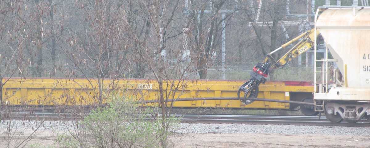| with a backhoe, lifting rail up and over the side and laying it on the ground. |