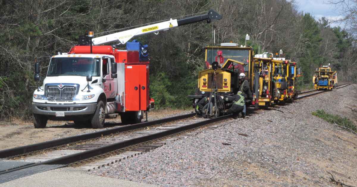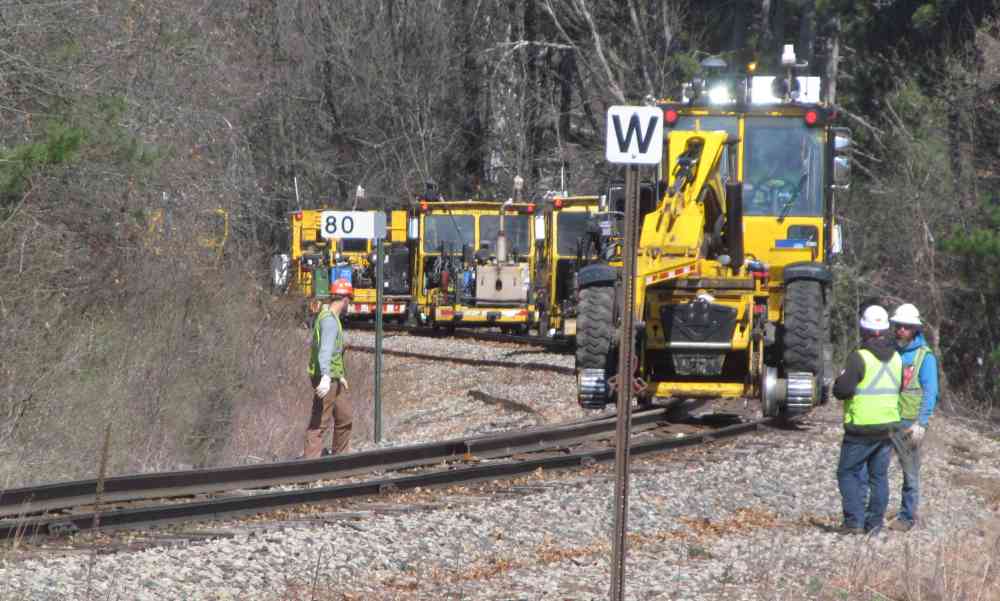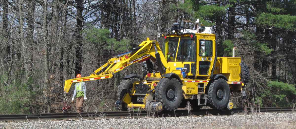 A Speed King Pettibone leads the way, lifting the new rail up and laying it between the old rails. I didn't spend all day watching the work. I think they unspike and roll out one rail at a time, while the wheels on the other side stay 'in gauge' to keep everything lined up over the existing spike holes. And after one side has new rail in place, then the other side can be rolled out. |
