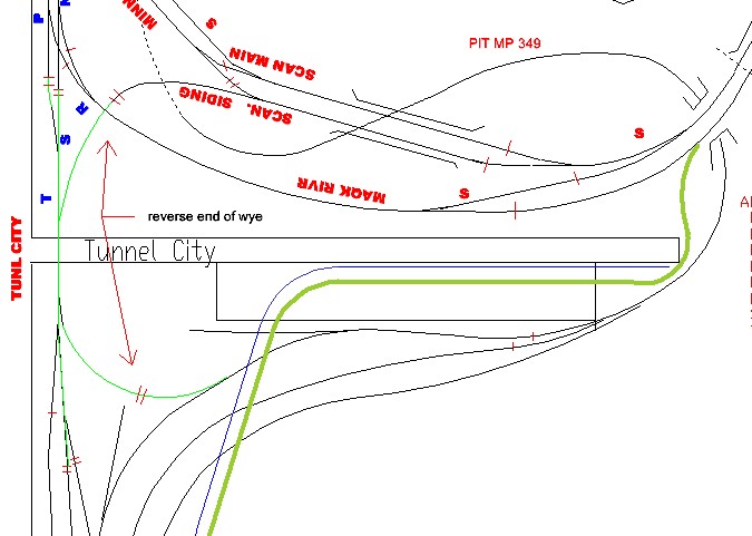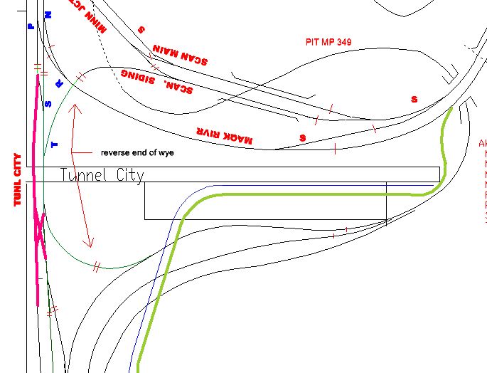 Below, the track plan is updated, with the new crossover on the left where the tracks go through the tunnels. The new crossover makes for convenient operation of two or 3 trains looping around the whole railroad, going the same direction. There was no more more room by the original tunnel switch labelled T to add any more crossovers. And all the track by T is part of a sectional control reversing loop auxiliary circuit. Sometimes I want to be lazy and not have to throw turnout T and set the Aux switch and reverse the main, which will reverse the direction of the other trains on the whole layout, which I don't want to happen. By setting T for the curve and the 3-way for the curve, the train curves into the reversing block and and leaves the reversing block without needing to change the Main direction switch. So, I can run 2 or three trains using one big throttle and not mess with throwing a lot of turnouts and electrical switches and the trains run a longer route without extra effort. Also, this is another place where trains may look like they are going opposite directions (electrically) but that's just an illusion of a dogbone inside of a circular loop track plan. |