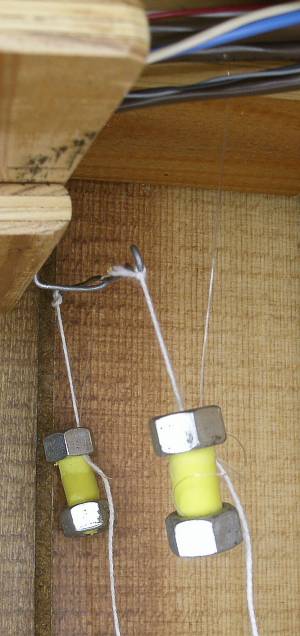 Small weights are below the board. Lifting one makes slack in that fishline,