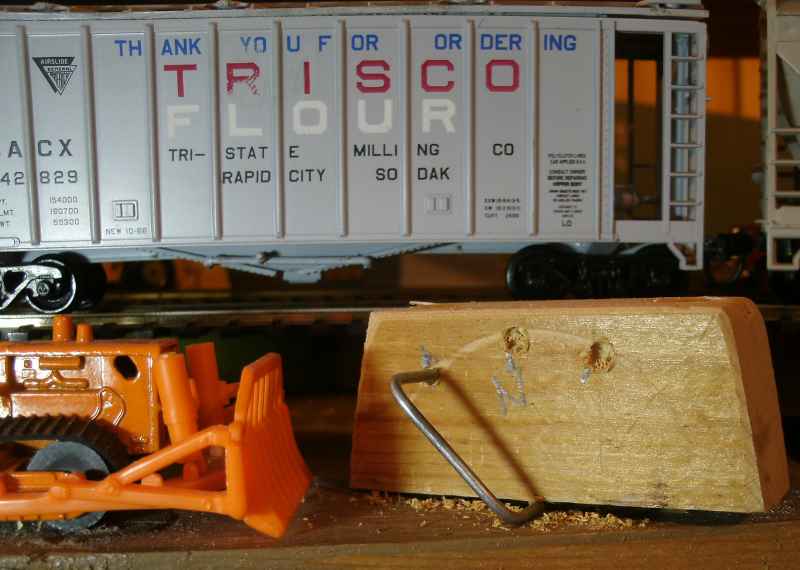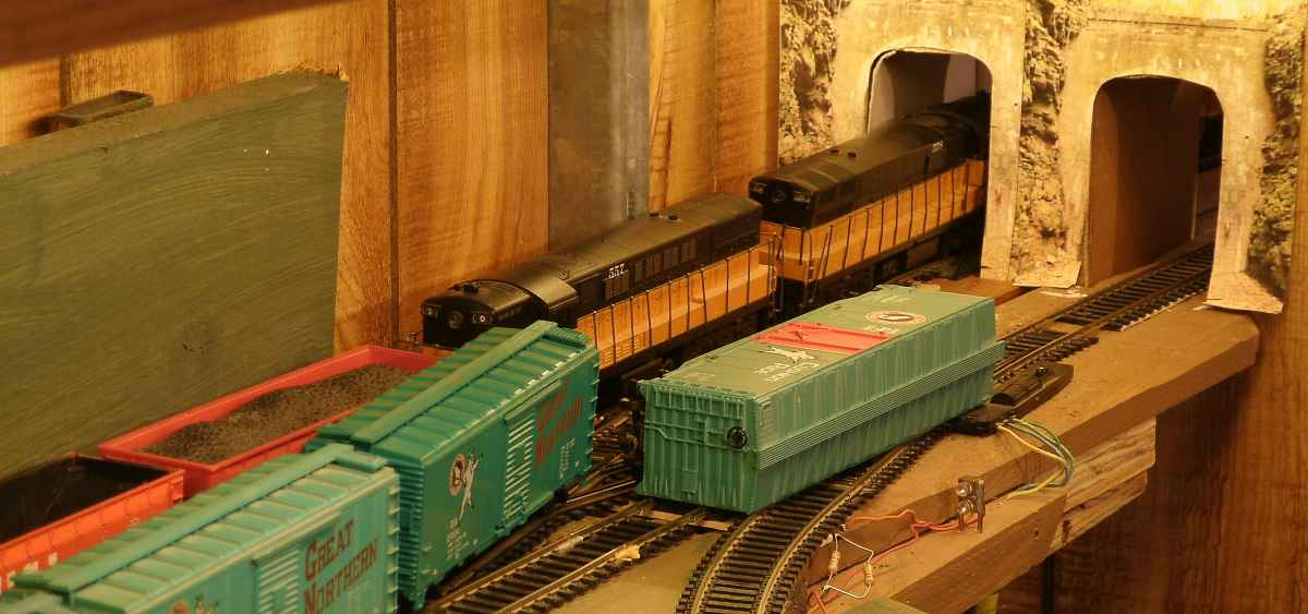 I have one problem with the new train routing scheme. If one train is coming downhill on the left, and another is coming uphill on the right using the cross over, and traveling the same direction. They can't both use the left track at the same time, obviously. And I have no automatic controls to prevent or warn me if I have done something dumb. Here, the downhill train has plowed into the uphill train and pushed just one car over. And even more interesting is just of out view through the tunnel are the two locomotives of the uphill train, coupled all together by themselves to make a 4-unit lash-up. |