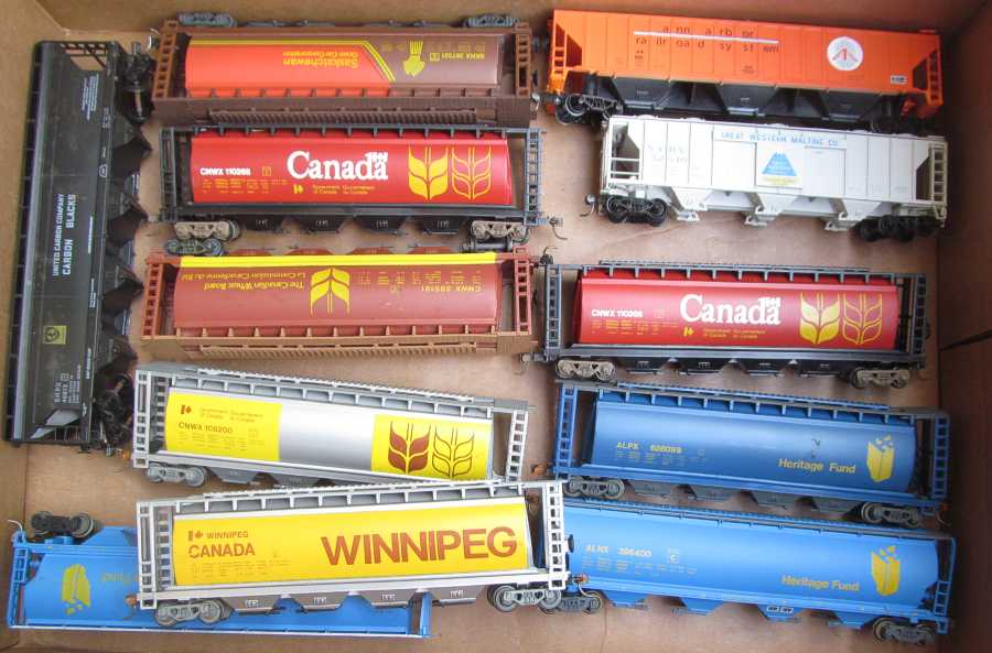 I had always wanted one Canadian cylindrical hopper car with the wheat symbol. And here, I found 5 of them. And some Saskatchewan and Alberta wheat hoppers. And some 1983 Winnipeg NMRA model railroad convention cars. I was concerned about the quality of the trucks and wheels (afterwards I learned some are Bachmann) Nothng beats rolling a car down a slight ramp (I have a wood shim that matches a 2% grade). It's not good enough to just turn a car on its top and roll the wheels by my fingers to tell how free-rolling a car is. |