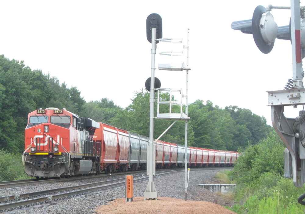 | An eastbound Potash train has the main at Rocky Run, west of Point |