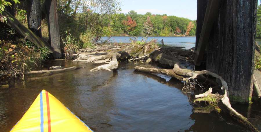 Last Autumn, I took a canoe ride under the trestle. There's still some floating stumps that have nestled up here for a long time. Also, not shown is a 4 inch tree cross-wise floating across the center of the channel in 2024, blocking it to canoe traffic. I had to pull a few branches away from the very south side to slide the canoe over the blockage. |