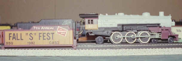 The "car" for this year was a custom painted AF tender shell from Hobby Surplus Sales decorated by Ken Hein. "S" GAUGE IS STILL GROWING Buyers could provide their own locomotive shell to be custom decorated by Ken Hein.--- Art Doty Hosted by the C.A.S.G. |