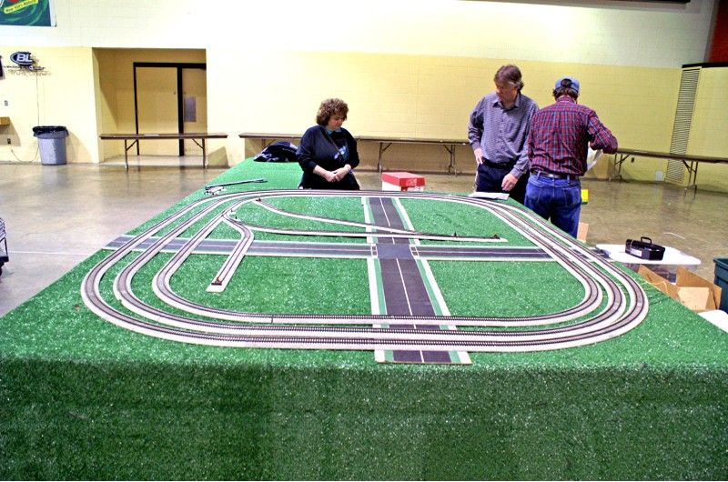 Volunteer members sometimes take the "walk around" table layout to the smaller shows allowing visitors to view and answer questions about S-Gauge. The table is just the right height for children and it attracts a very large crowd of kids of all ages. Designed for easy set-up and tear down, this module has three train operation and sometimes includes a siding. The rails are S-Trax from S Helper Service with the roadbed built in.