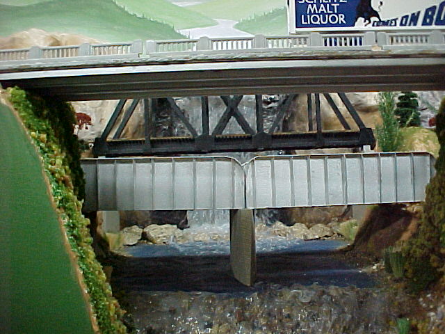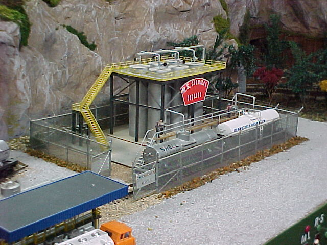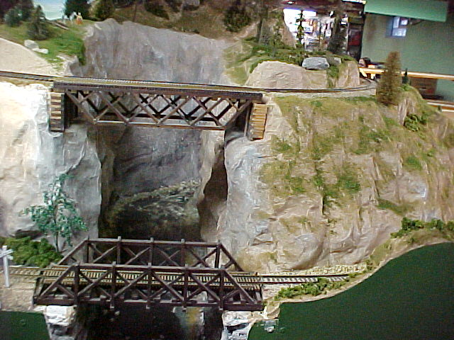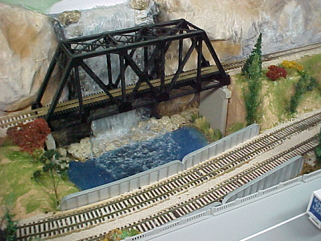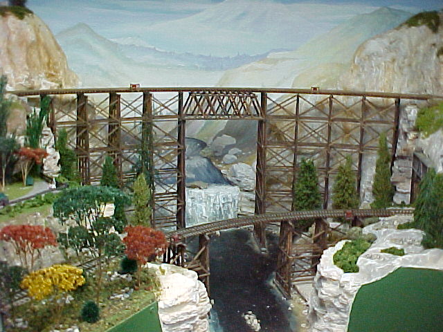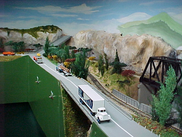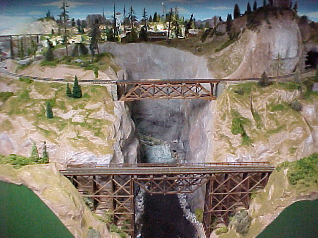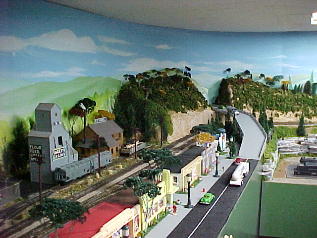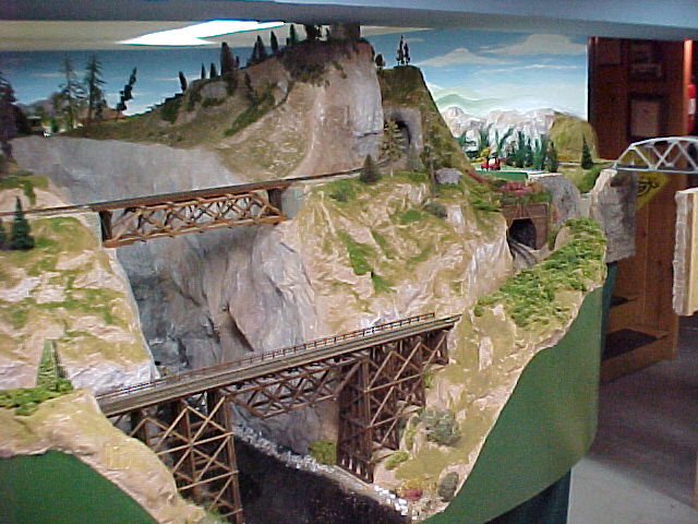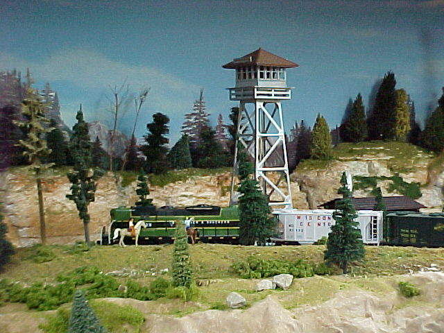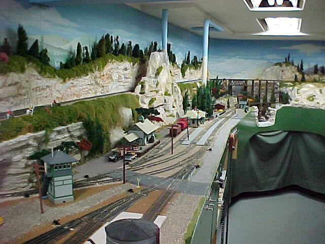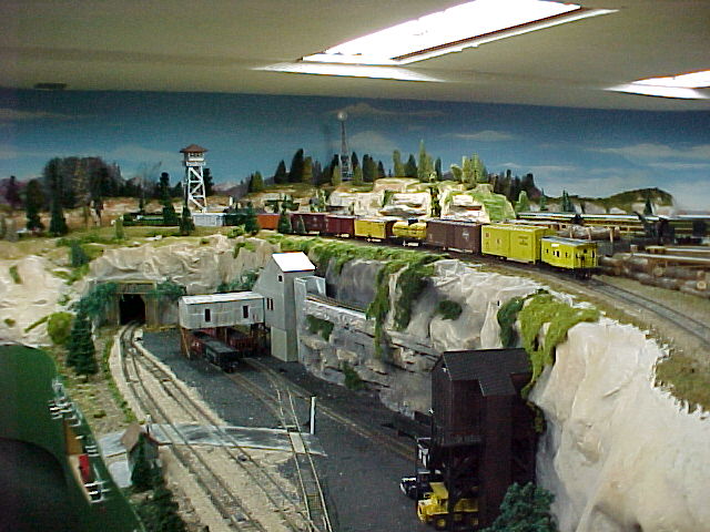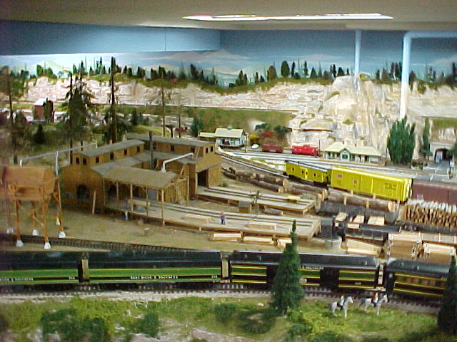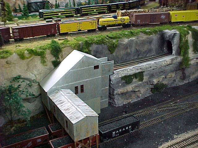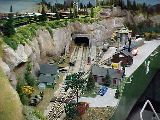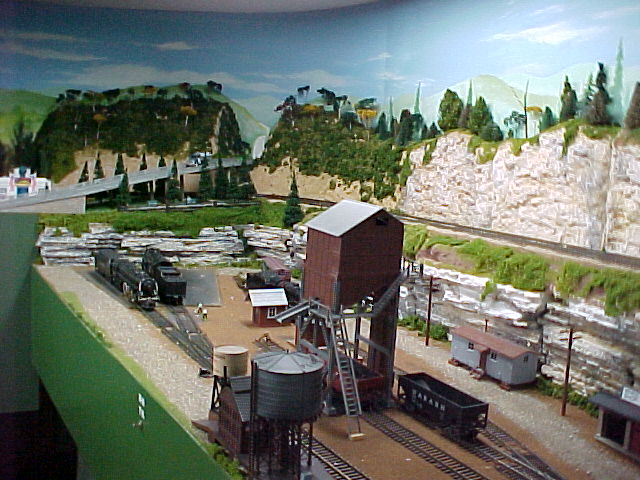 To run either version of wheel-sets on the same rail takes a lot of consideration up front when dealing with switches and crossovers due to flange height and inner wheel spacing. Some of Dick's switches were custom built to allow either type of wheel set to pass over without it considering derailing. Locomotives are from American models with exceptions of 1 diesel switcher from S-Helper Service. Dick also has converted some flyers over to can motor as well to deal with the DC current efficiently. The saw mill was scratch built as well as some of the other accessories. One of the coaling towers is a Lehigh Valley Models kit while the other is modified from Plasticville. The terrain was constructed using plaster over cardboard.