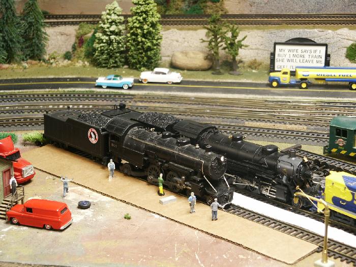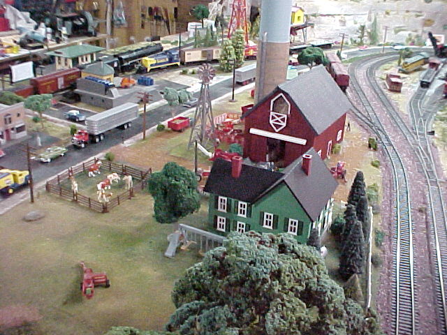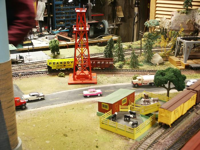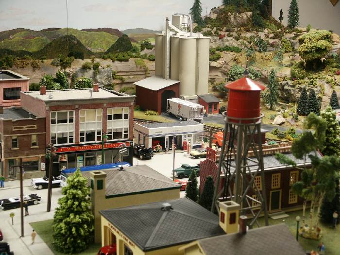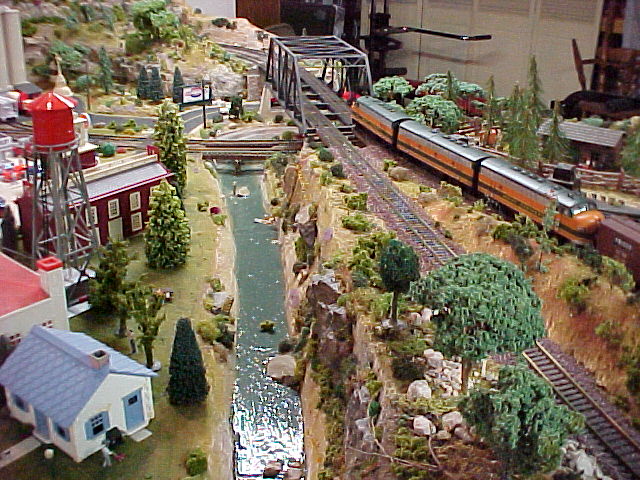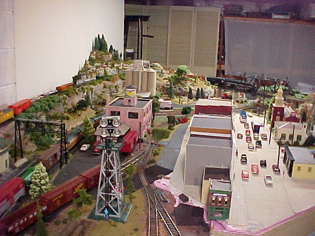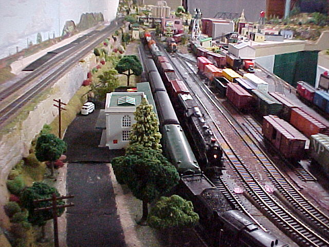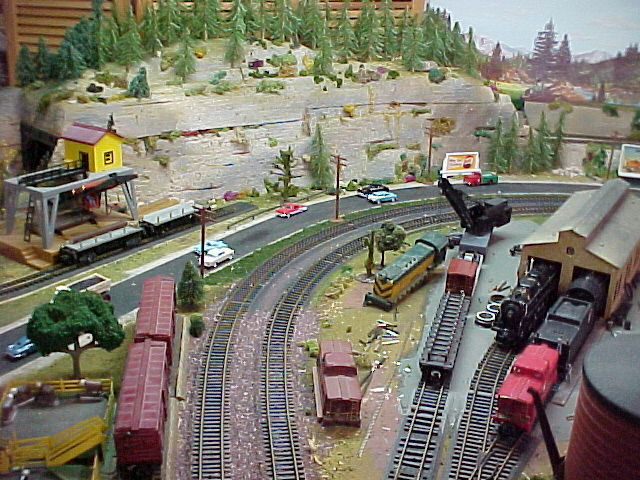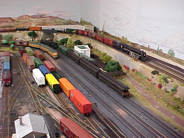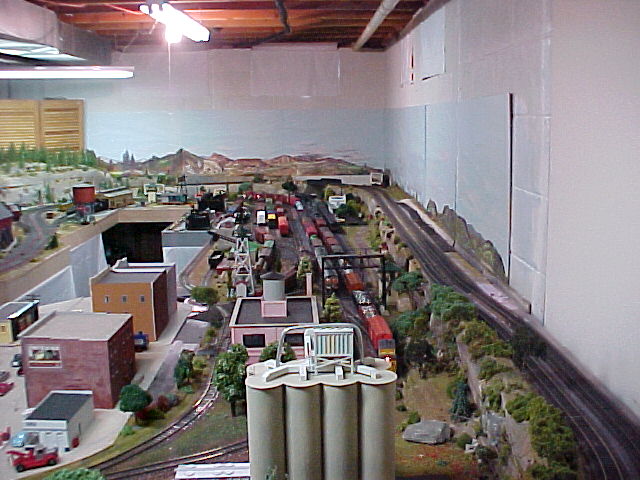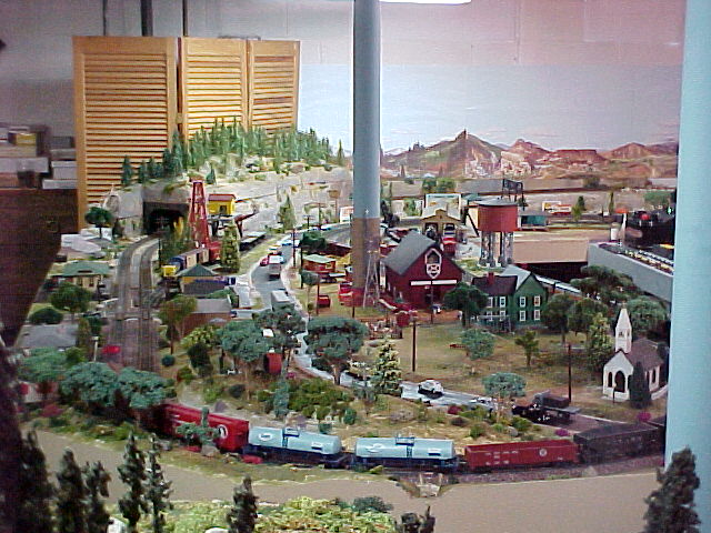 Steve's layout takes place at the foot hills of a mountain range somewhere in the American West possibly between Denver and Galveston allowing service from both railroad lines. His freight and passengers are delivered to the city via Great Western and Santa Fe Railroads. Businesses are serviced in town as well as a coal mine in the foot hills. Running the Great Northern allows traffic from the Burlington, CB&Q and many others and the herald and war paint from the Santa Fe is unforgettable.