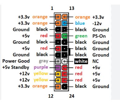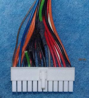 The two wires that make the unit power up are the green wire combined with the black one. When tied together they turn the supply on. This can be done by combining them simply with a wire nut or solder if it gets powered up by 120v input cord or a switch if you wish to remotely start the supply. The power on wire (sometimes other colors than green) is the fourth one from the left end when looking at the clip side. (see picture on right)