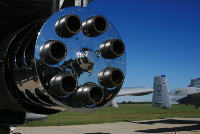 | General Characteristics Primary Function: A-10 -- close air support, A-10C - airborne forward air control Contractor: Fairchild Republic Co. Power Plant: Two General Electric TF34-GE-100 turbofans Thrust: 9,065 pounds each engine Wingspan: 57 feet, 6 inches (17.42 meters) Length: 53 feet, 4 inches (16.16 meters) Height: 14 feet, 8 inches (4.42 meters) Weight: 29,000 pounds (13,154 kilograms) Maximum Takeoff Weight: 51,000 pounds (22,950 kilograms) Fuel Capacity: 11,000 pounds (7,257 kilograms) Payload: 16,000 pounds (7,257 kilograms) Speed: 420 miles per hour (Mach 0.56) Range: 800 miles (695 nautical miles) Ceiling: 45,000 feet (13,636 meters) Armament: One 30 mm GAU-8/A seven-barrel Gatling gun; up to 16,000 pounds (7,200 kilograms) of mixed ordnance on eight under-wing and three under-fuselage pylon stations, including 500 pound (225 kilograms) Mk-82 and 2,000 pounds (900 kilograms) Mk-84 series low/high drag bombs, incendiary cluster bombs, combined effects munitions, mine dispensing munitions, AGM-65 Maverick missiles and laser-guided/electro-optically guided bombs; infrared countermeasure flares; electronic countermeasure chaff; jammer pods; 2.75-inch (6.99 centimeters) rockets; illumination flares and AIM-9 Sidewinder missiles. Crew: One Unit Cost: Not available Initial operating capability: A-10A, 1977; A-10C, 2007 Inventory: Active force, A-10, 143 and A-10C, 70; Reserve, A-10, 46 and OA-10, 6; ANG, A-10, 84 and OA-10, 18 From the A-10 Thunderbolt East Demonstration Team website (Link on Links Page) |