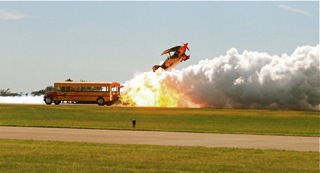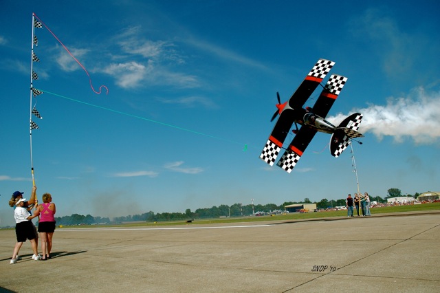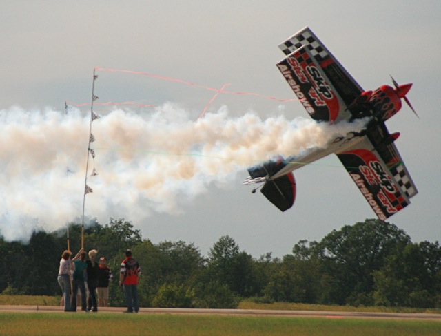 Photo Credit: Bob Cox, Show-n-Off Photography, La Plata, MO.Above, Skip has already clipped the top, 16-ft. pink ribbon, and, on his second pass, is cutting the green 10-ft. high ribbon as Bob Cox snapped this photo from his position right on the edge of the runway.