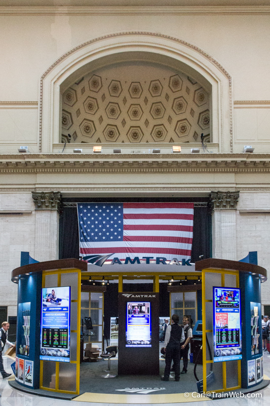 A new Amtrak information kiosk in the large waiting room of Chicago