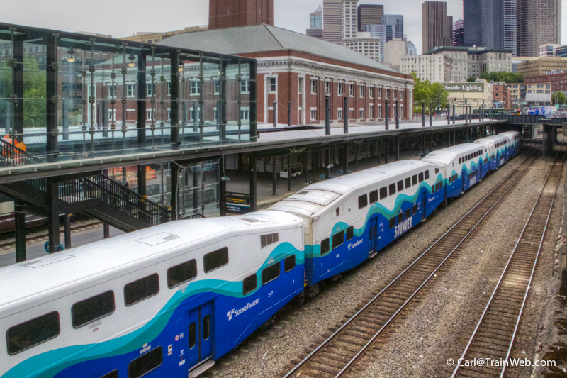 The Sounder commuter train stops at the Amtrak Station as well as Amtrak's Empire Builder and Coast Starlight.