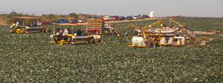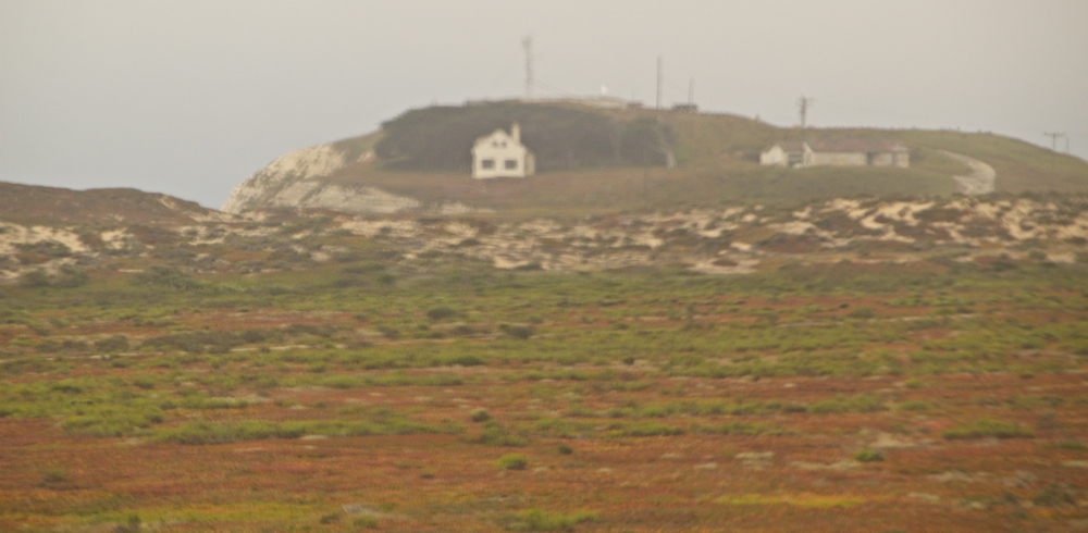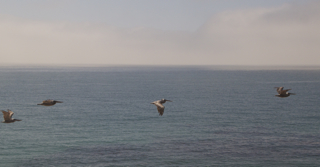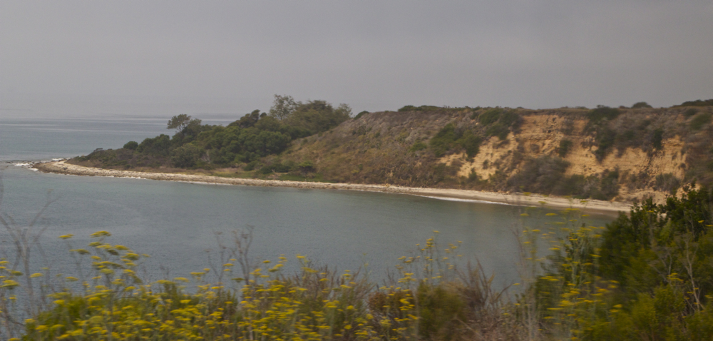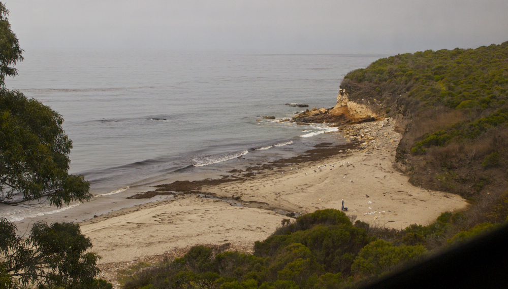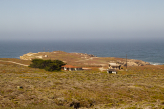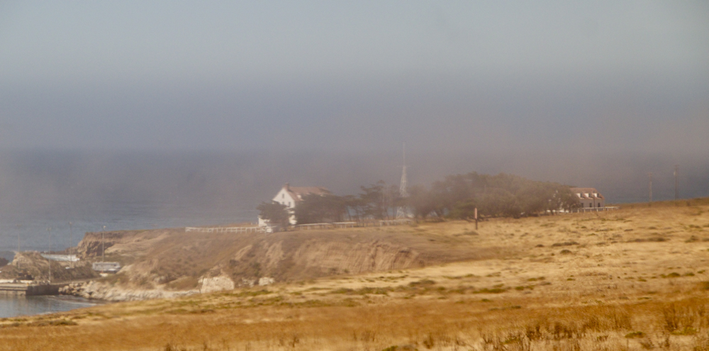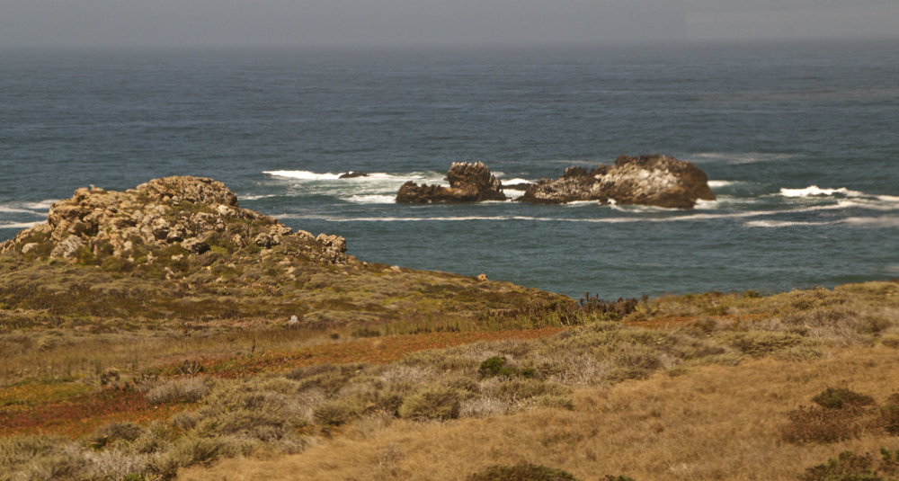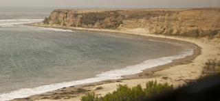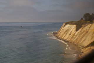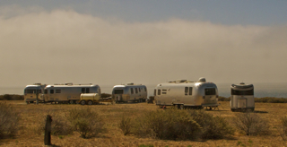 ![]() Covered Wagons circled on the bluffs above the Pacific Ocean. |