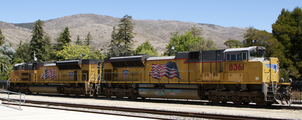 ![]() Union Pacific locomotives await assignments, perhaps as helpers over Cuesta Grade just north of town. |