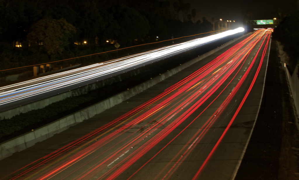 A long camera exposure makes Hwy. 101 from the California St. Bridge look like a jetway. |