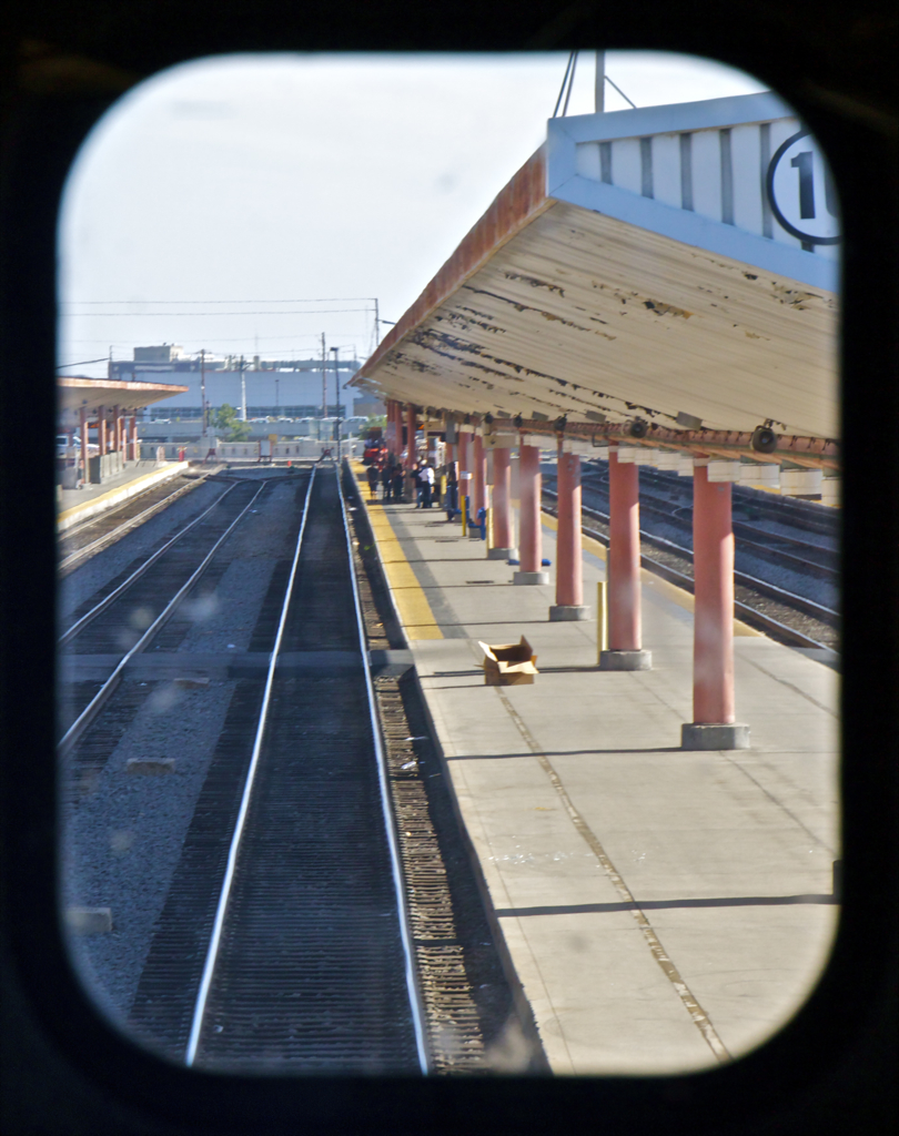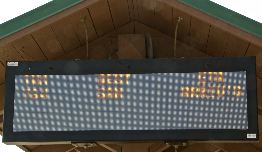 ![]() A sign announces our arriving train. I wonder, with all this horizontal space, why most words are abbreviated to 3 or 4 letters when space would allow them to be spelled out. |