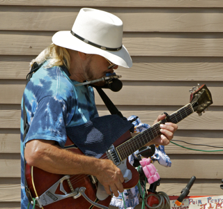 I found this fellow, outside Ericsson's, playing tunes more to my liking. He was playing on a 1950s guitar. |