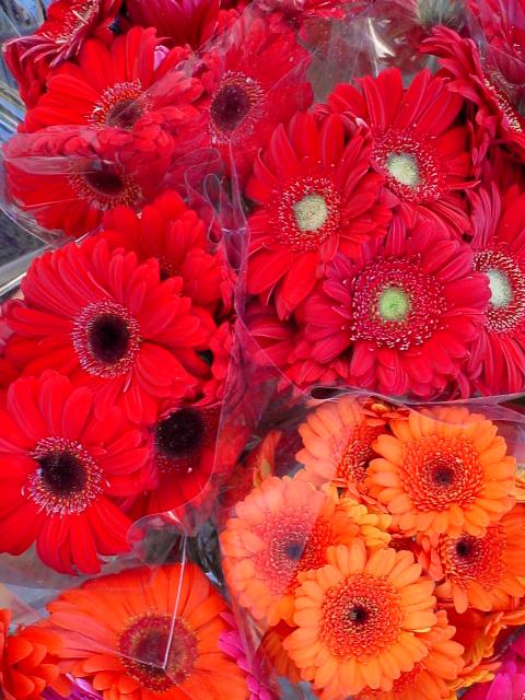 into a Farmer's Market with beautiful displays of flowers, vegetables,
