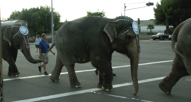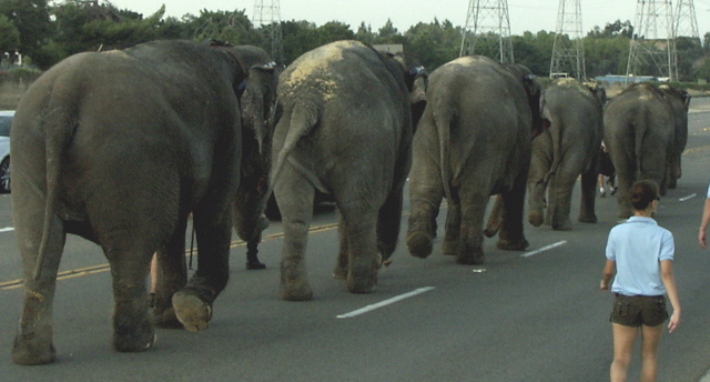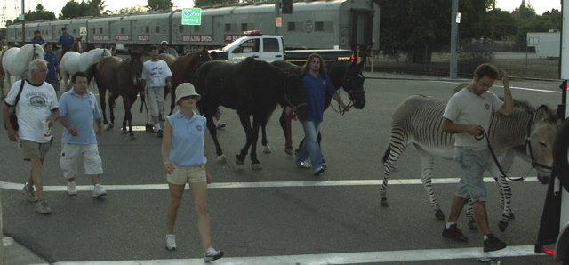 The small animal trailer followed the elephants, then the two zedonkeys.