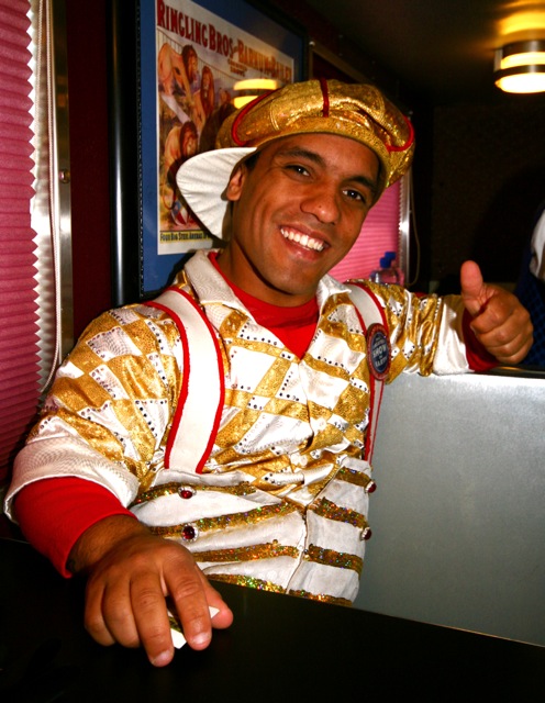 Paulo dos Santos-Nano's Bio.:After 8 years of training, Paulo became skilled in the art of Capoeira, which is a combination of martial arts moves, dance moves and acrobatics, including straps, and is extremely popular in Brazil. He is also a teacher of the art of Capoeira. Four years ago he went to the Brazian Circus, Teatro, for 3 years. He went to a Ringling audition with 20 'little guys' where he performed trampoline, acrobatics and straps. He won the job and is now with the Blue Unit of Ringling's Circus.