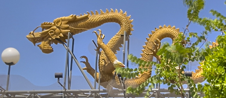 Gray 'waterslide' on right is a new high school, central tan bell tower of the new Catholic cathedral.