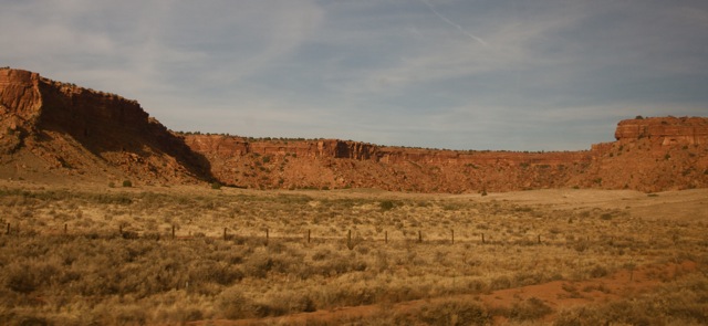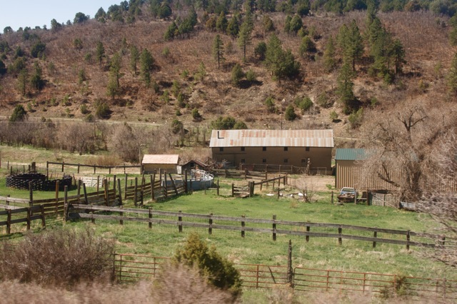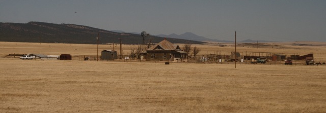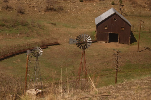 windmills in NM, with telegraph wires, cattle hay feeders and a brown
