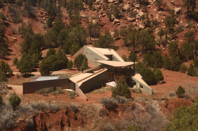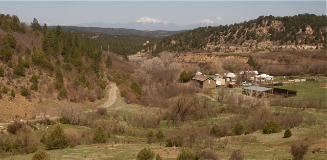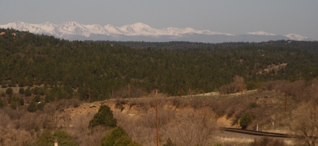 and the original Santa Fe Trail and distant snow-capped mountains.