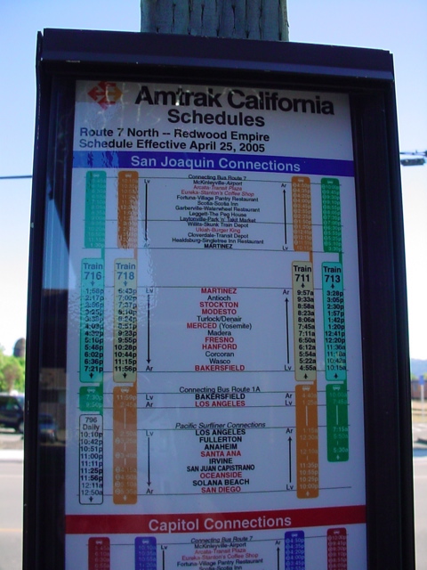 Trains. These schedules are posted outside the Skunk Train Depot:
