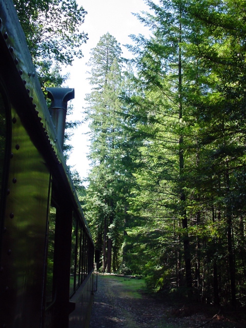 The redwoods and firs dwarfed our Skunk Train.
