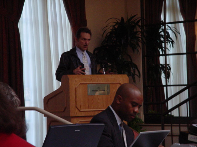 ««This panel consisted of (left to right) Roger Snoble, Friends 4 Expo Rail's Darrell Clarke, Metrolink's Mike McGinley , and TRAC VP Roger Christensen . Darrell felt that light rail going down freeways is a terrible idea since it is a terrible place to wait for a train, it doesn't go where people want to go. The Blue Line is the 2nd largest light rail line in the US.