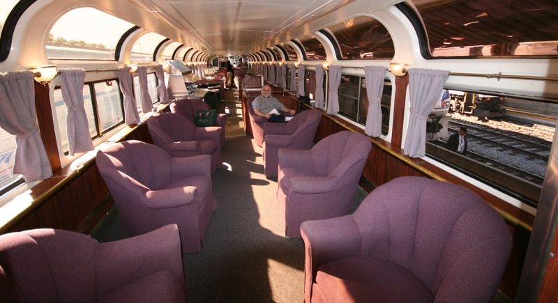 (A refurbished Lounge Car in which sleeper passengers can lounge for the trip and order drinks from the bar,