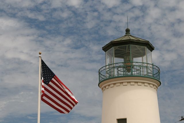 lighthouse is across from the beach.