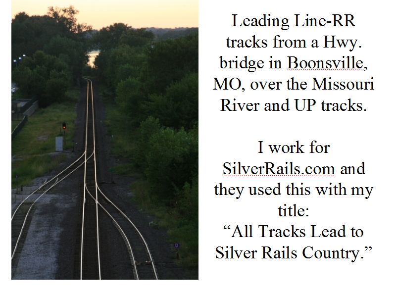 Leading Line-RR tracks from a Hwy. bridge in Boonsville, MO, over the Missouri River and UP tracks. I work for SilverRails.com and they used this with my title: “All Tracks Lead to Silver Rails Country.”