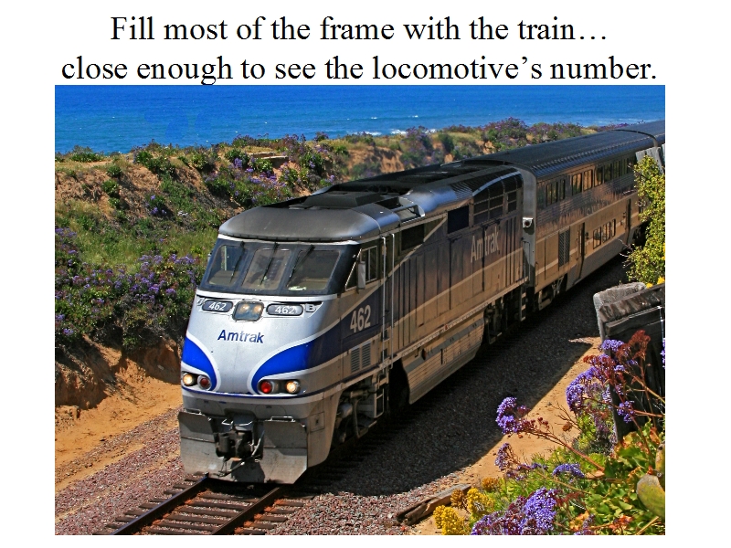 Fill most of the frame with the train… close enough to see the locomotive’s number.