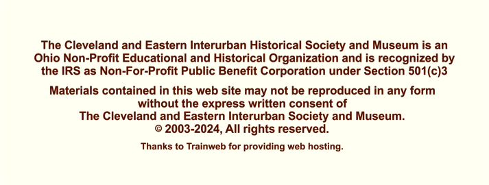 Welcome to the Internet Home of the Cleveland and Eastern Interurban Historical Society and Museum! We are a non-profit group dedicated to the preservation of artifacts and materials relating to Northeast Ohio's Interurban Railways. Our goal is to educate the public about this fascinating part of Ohio's transportation history.