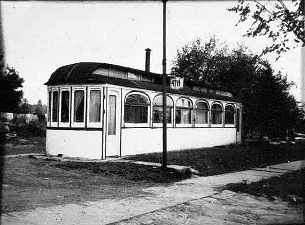 This photograph shows the car body of Kuhlman Coach #53 near Lee Road and Miles Avenue in Cleveland. It survived for many years as a diner. Note the bus stop sign in the foreround.