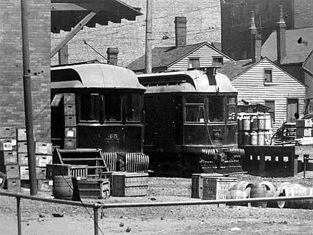 This photograph shows C & E freight motors #45 and Geauga together at the line's Eagle Avenue depot.