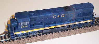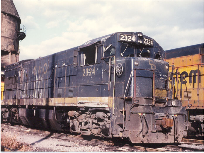 My U23B is an Atlas model that came without a road number. I chose 2324 since it was even and I could not find a picture of it in Chessie colors. 2324 may have made it though the entire Chessie Era looking like this, I don't have any evidence to the contrary. The following were definetly painted in Chessie colors, 2300-2306, 2308-2311, 2313-2315, 2318-2323, and 2325-2329. That leaves 2307, 2312, 2316, 2317, and 2324 as the only ones that could have never seen Chessie paint. Since I use odd numbers for unpowered units and evens for powered units that really leaves me with 2312, 2316, and 2324 as possibilities. I chose 2324 since it has good weathering and would make a good model. Notice how the GE units paint peeled. The area right behind the big "C&O" on the side always looked horrible on these units regardless of Chessie or predecessor paint.