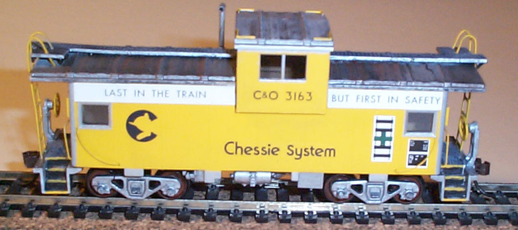 Chessie System Safety Cabin C&O 3163: This is a typical safety cabin paint job. It is the only one I have seen with silver wheels and underside. It is an Athearn kit with Microscale decals. For a "how to" article see the tips page.