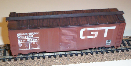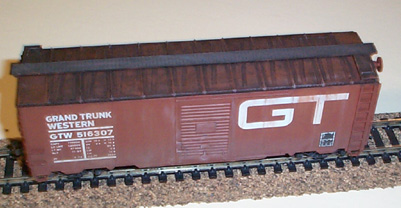 Accurail 40 ft smooth sided boxcar. This is a great little boxcar with excellent lettering. It is an easy one night project. I simply assembled it by the instructions, streaked some rust colored paint over the bright white letters to give it the appearance of age. Also applied a ink and alcohol wash to the roof. I drybrushed the roof rust colored and white after the ink was dry. Add some road grime along the bottom and paint the wheels rust color and you are done. A great project. These pics show both sides of the model.