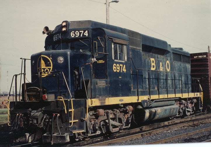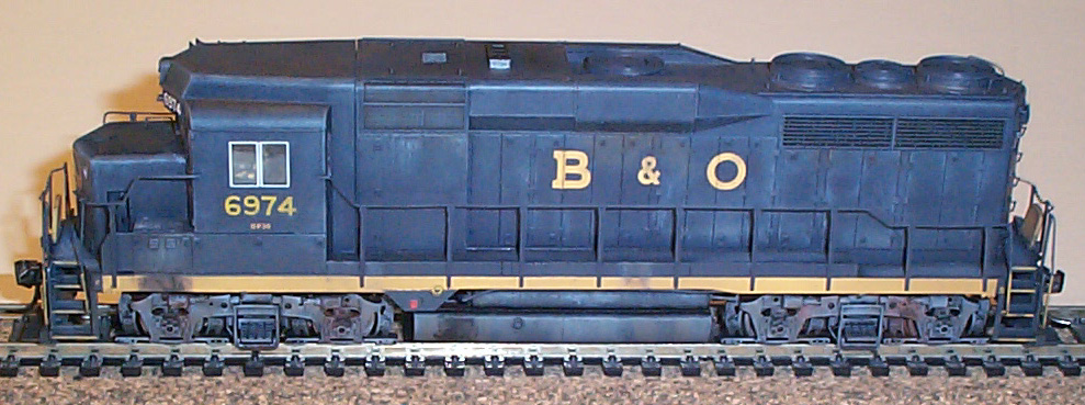 The GP30's are unique amongst General Motors designed locomotives in that they have a noticeable buldge above the numberboards. This hump gives the GP30 a very stocky appearance. They are a favorite amongst railroad modelers. My #6974 is a Life-Like Proto 2000 model that came decorated as B&O #6950. See my Life-Like Proto 2000 GP30 page for information on how to build this unit. I built this unit at the same time as nearly identical GP30 #6930.