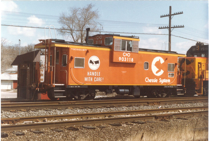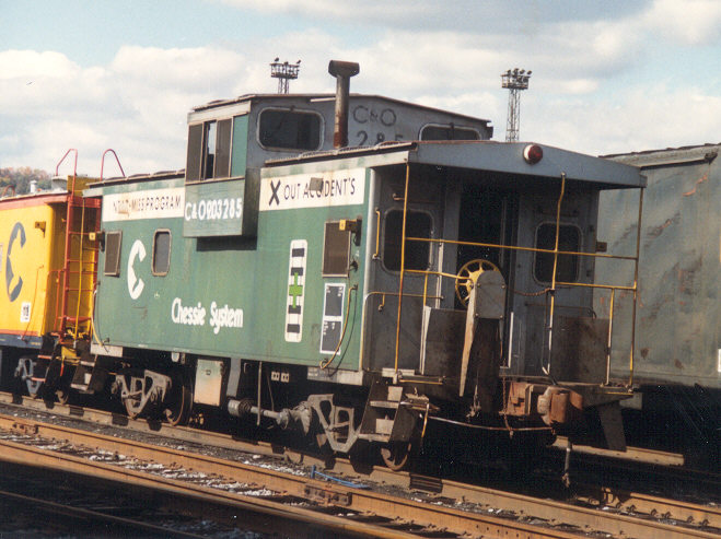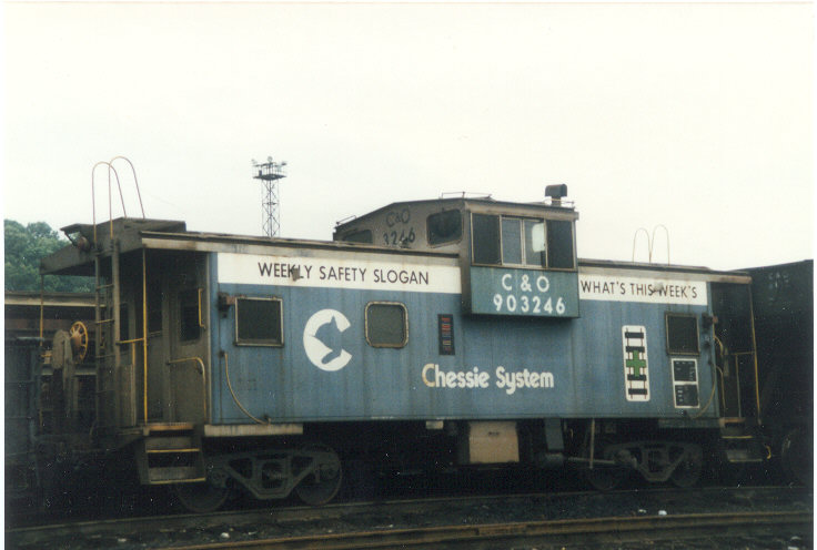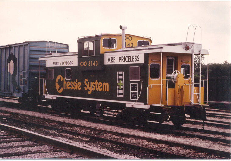 I have chosen to do 4 Safety, 1 "Careful Car Handling", and 1 Standard Chessie wide vision cabeese. These cabeese, unlike the previous article in this "tips" section, have wire grab irons. Below are six pics of Dean Heacock's of the cabins I am doing. As you can see they are very colorful. The first one is 3143. 3143 was originally a lighter green with silver ends, but it got the yellow ends as shown here. That is how I modeled it. The other safety cabins have silver ends, but only 3163 (Yellow) even looks silver. 3163 is so newly painted, look at the wheels, it probably just rolled out of the paint shop. I modeled this one clean as in this pic.