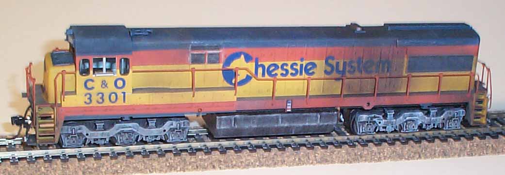 The Athearn kit comes powered or dummy. Powered should cost around $25, dummy around $12-15. There are some U28 type features that need to be changed, but nothing really major. The headlight on the nose needs to be removed. The two boxes on the left side, right behind the cab need to come off too. There are two sets of grill vents right in front of the radiator, right behind the "System" in the pic below. You can replace these doors with detail parts or live with the minor discrepency. I chose to live with the discrepency. Out of the box it is 75% or so accurate for the C&O units #3300-3303. With a little help it can be almost 100% accurate.