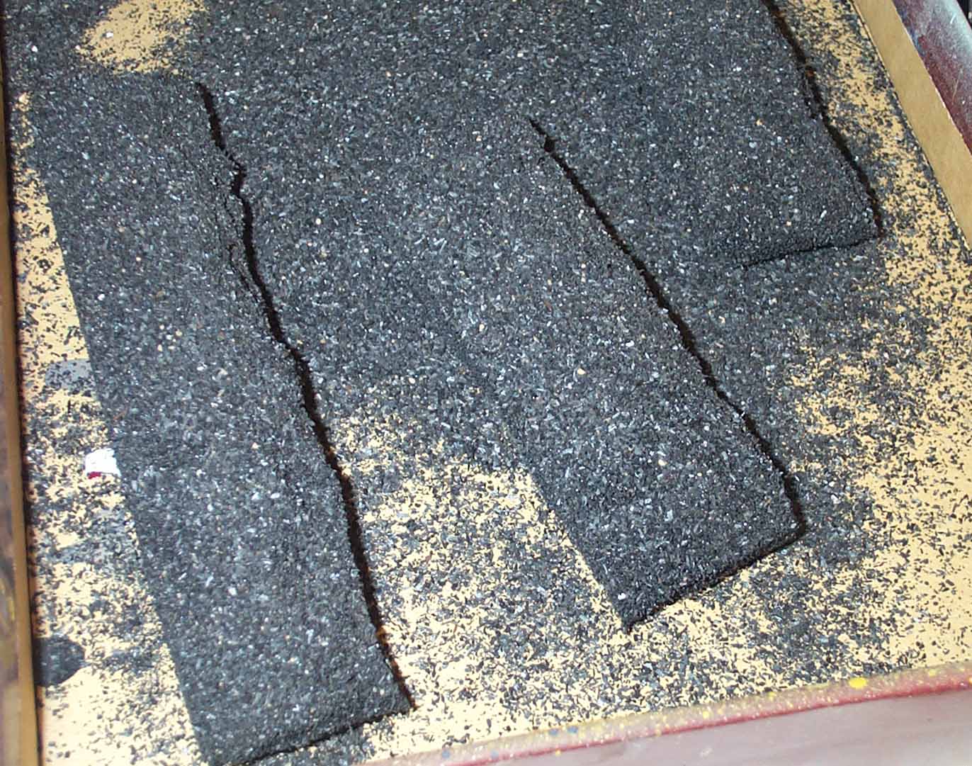 fleet of hopper cars. It involves just foam, spray paint and real crushed coal.