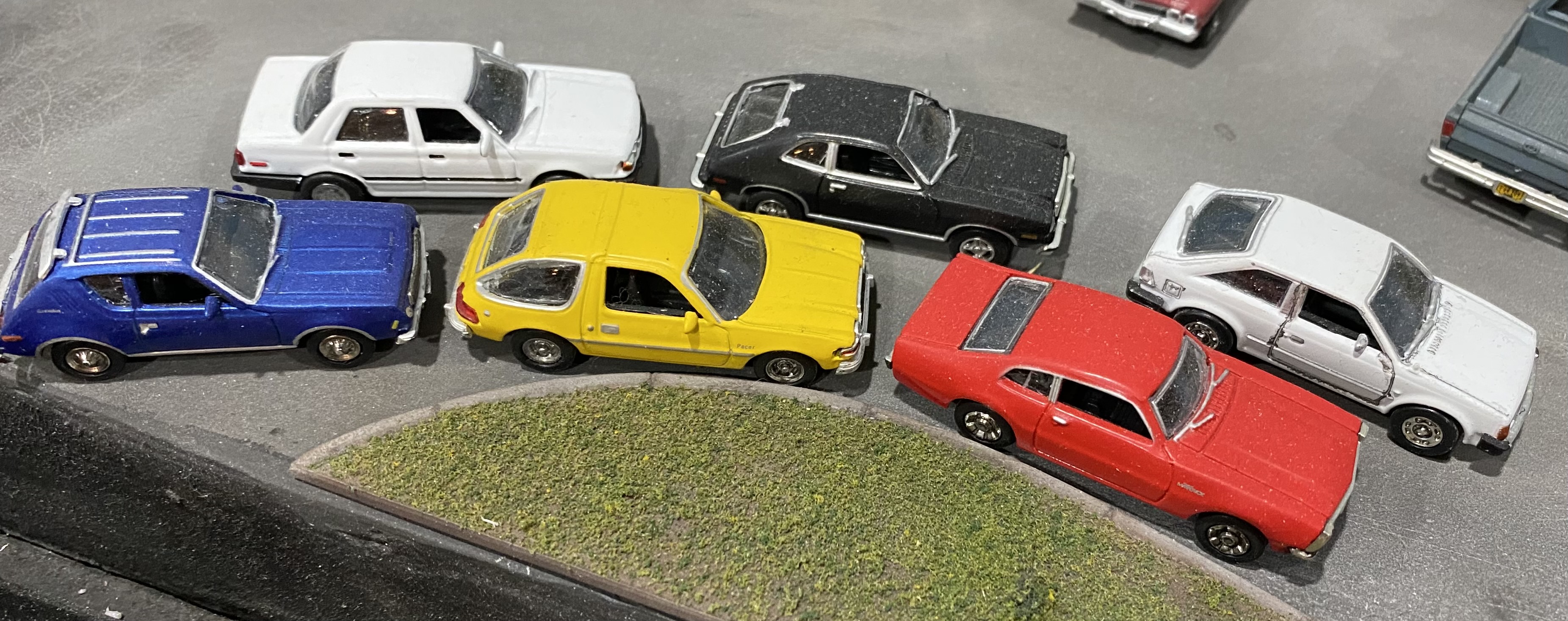 a yellow AMC Pacer and a red Ford Maverick. The back row