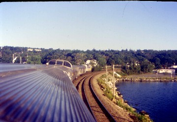 VIA 619 Bras D'Or 8/30/2000Once aboard, I told the service manager Ken Cairns about my dilemma and he said he would assist me. The car attendant, Shamus McDonald, bought me a Coca-Cola at my request and I started my westward journey home from the shores of the Atlantic Ocean all the way across North America to my home in Santa Ana and wrote postcards and read the newspaper until departure time. Today's passenger count was a mere nine, so there was even more space to move about. Sydney Harbour was fogged over until we reached the south end and I returned to the Park Car dome and enjoyed the causeway before sitting back and taking in the whole scene while listening to music.